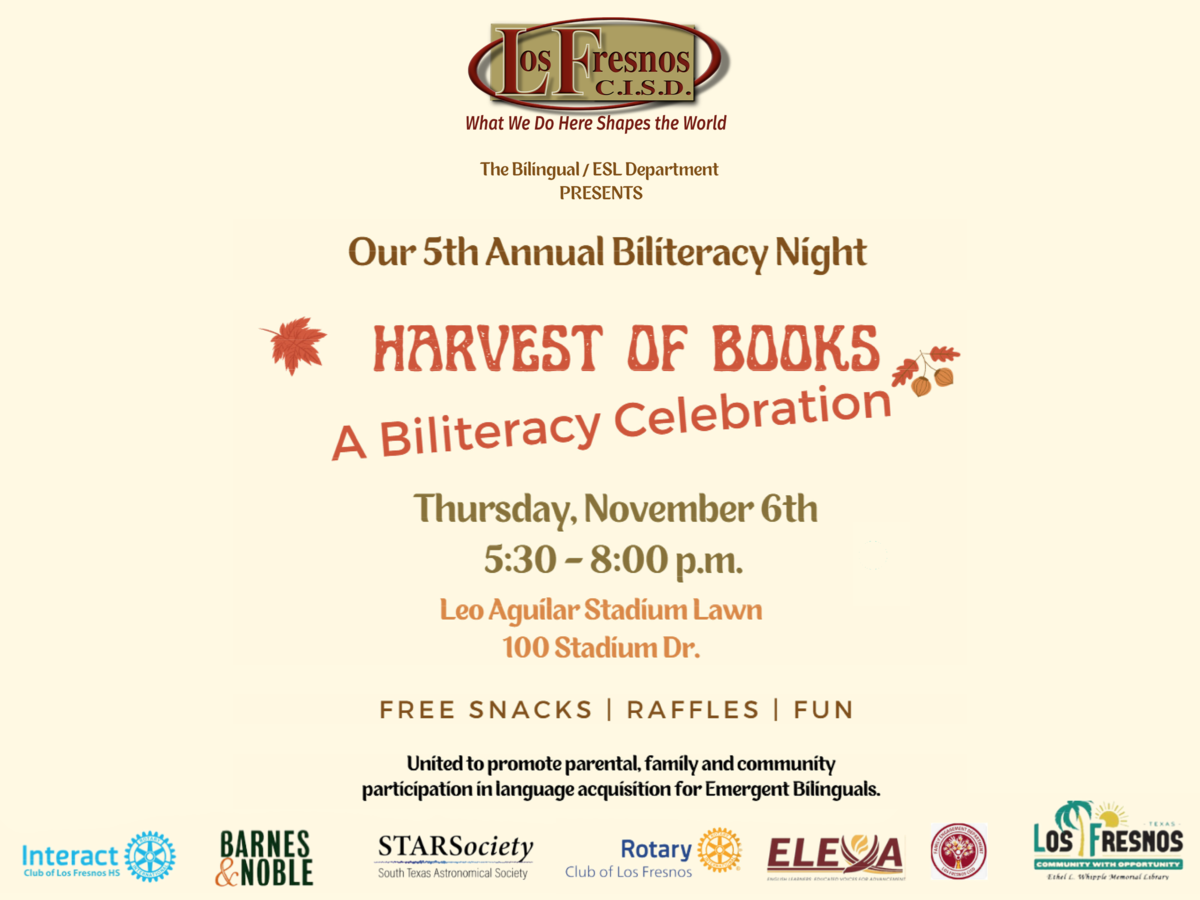 Los Fresnos CISD will once again host its annual “Cosecha de Libros” Biliteracy Night, a vibrant celebration that promotes literacy among families, the community, and bilingual learners.
